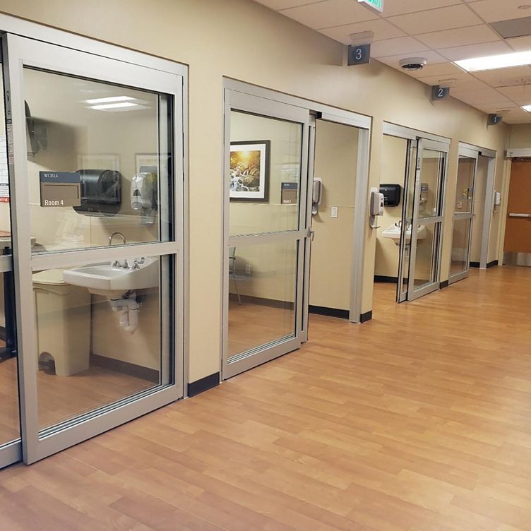 Record’s manual sliding ICU door packages are available in multiple configurations that allow the architect total freedom in the design of a patient facility.One may select from two, three or four panel options, both with or without floor tracks.Other possibilities include either three or six panel telescopic designs, again both with and without floor tracks. To satisfy all of the requirements of the healthcare facility, the doors may be specified to breakaway either into the patient room, or out into the hallway–whichever option best allows for quick and unimpeded transportation of patients either in wheelchairs or on gurneys.