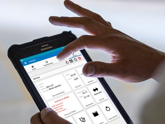 Der zugriffsberechtigte Techniker kann sich mit Hilfe eines WIDI (Dongle) über die i-record App per Bluetooth® mit der Tür verbinden. Ist die Verbindung zur App hergestellt, lassen sich mit wenigen Klicks die Türe in Betrieb nehmen, Parameter und Sensoren konfigurieren, Software aktualisieren und eine Fehleranalyse sowie eine Fehlerbehebung durchführen.