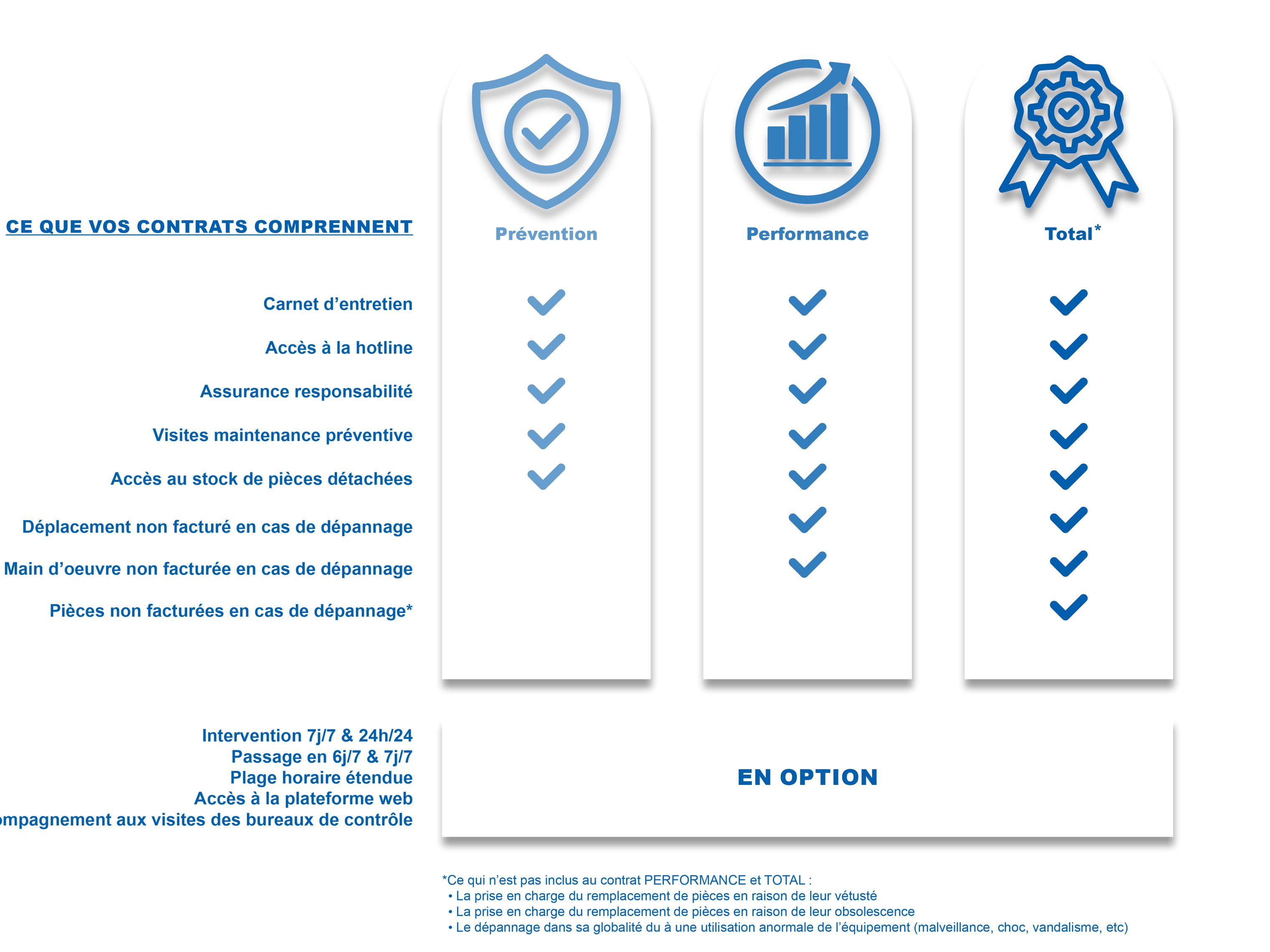 Choisissez parmi des forfaits prédéfinis qui couvrent tous les besoins de maintenance essentiels, ou contactez nous pour étudier une offre personnalisée, avec des options adaptées à votre installation et conforme aux normes en vigueur.