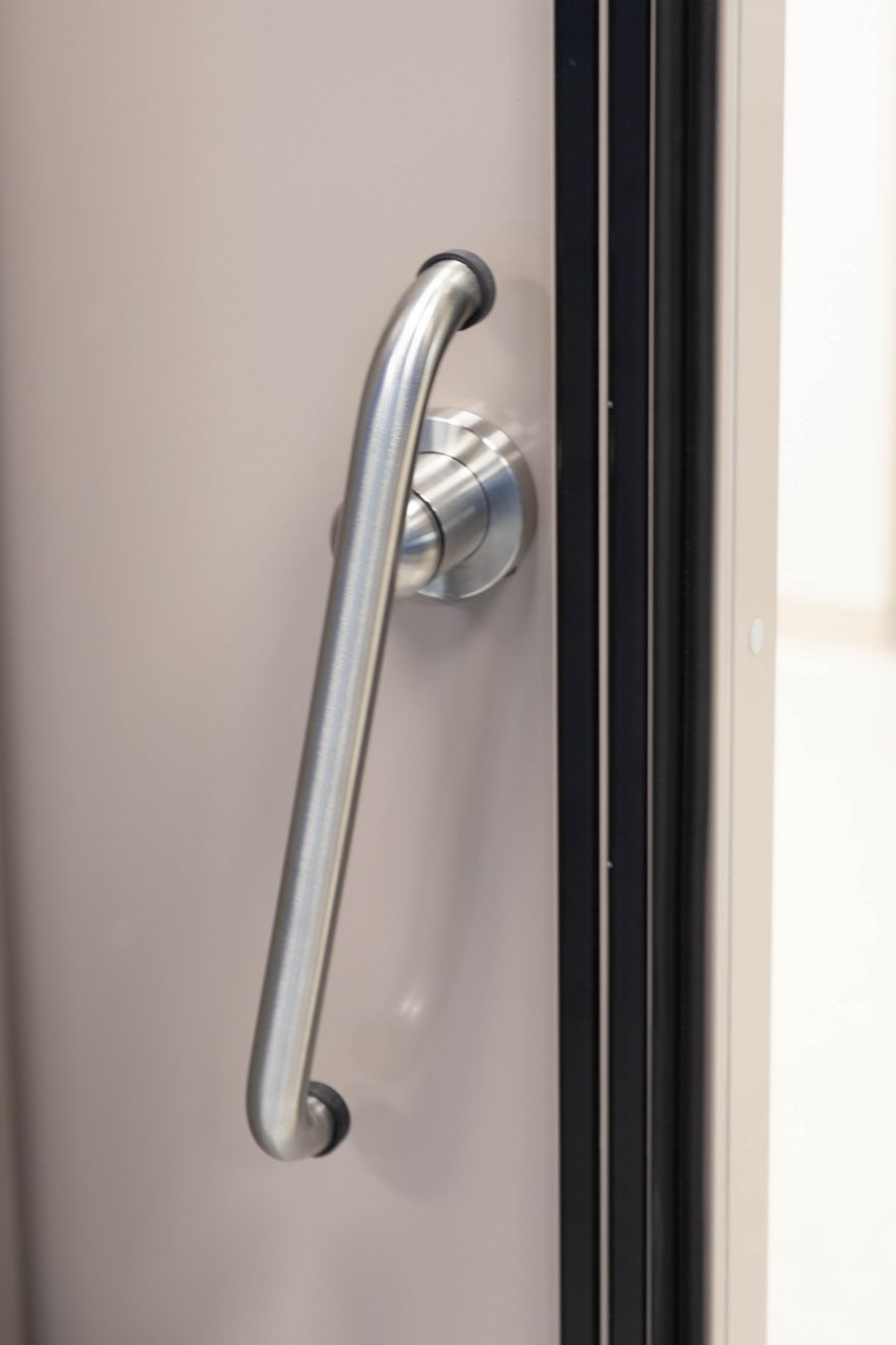 The door core of our record CLEAN K1-A -dB is noise-absorbent and surrounded by rubber seals. Available in sound-proofing stages of 34 dB, 37 dB and 42 dB. The surface can be designed with high-grade steel or freely designable HPL. A combination of the materials is also possible.